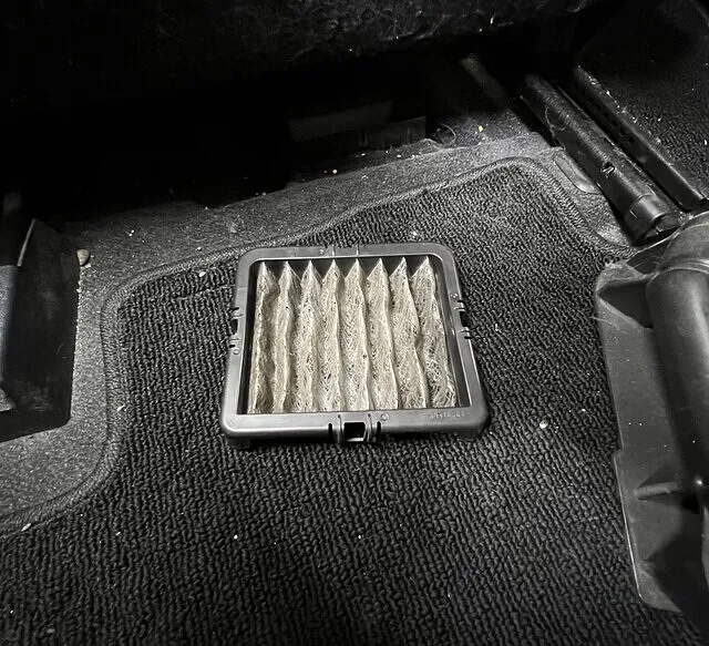 みなさんご存じですか?ハイブリッド車には駆動用バッテリーを冷やすための吸気口が設けられています。今回は前回車検から清掃していないため結構汚れが結構詰まっています。当社では、安心・安全にお乗りいただくために車検・点検時に点検して、清掃をしております。