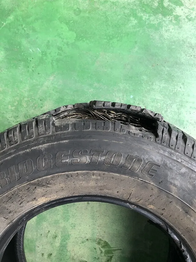 新品に交換時、バーストしたタイヤはゴムとは思えないほど固くなってました。最近の気温差や走行時の段差などで急激に負荷がかかったんだと思います。事故にならなくてほんとによかったです。